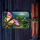 A etiqueta de bagagem artística e colorida apresenta trabalho de arte digital assistida por IA que destaca a jornada da borboleta em um mundo de fantasia mágica