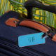 Etiqueta de bagagem personalizada com um tema náutico. fundo azul marinho. Um quadro azul com borda amarela colocada sobre o topo. Um farol listrado vermelho e uma bola de praia, com um sol sorridente e uma gaivota na distância posicionada dentro do quadro.