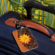 Nome de etiqueta com fotografia em tons quentes com grãos de café e margarida amarela pintada com laranja sobre fundo de madeira.