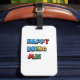 Etiqueta de bagagem branca com letras impressas no arco-íris. "Happy Being Me", férias, viagem, cores