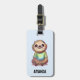 Uma etiqueta de bagagem com uma ilustração adorável com uma preguiça de aparência feliz vestindo uma camiseta verde. Sentado de pernas cruzadas, com aparência relaxada.
