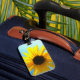 Esta etiqueta de bagagem tem uma flor amarela.