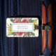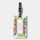 Viagem com esta etiqueta "Blooming Flowers", com folhas verdes, com flores roxas amarelas, azuis e avermelhadas, sobre fundo amarelo claro e centro branco na frente. A etiqueta tem um lado verde.