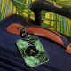 Uma etiqueta de mala monificada com atração tropical, esta design apresenta folhas de bananeira verde-aquática e frondes de palma em volta de uma moldura circular com o seu monograma desejado. Vire seu cartão de visita para o flape traseiro e você está pronto para viagem.