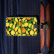Fatias e folhas de laranja. Um padrão perfeito. Cor de fundo personalizada. Texto personalizado de ambos os lados.