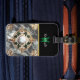 Uma roseta de ouro circular com padrões florais complexos e folhas verdes centrada num fundo de mármore branco.
