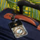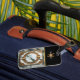 Um isqueiro dourado com design de mármore, com detalhes complexos e um quadro circular.