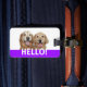 Diga olá!! Características deste design uma fotografia de dois cães de sorriso do golden retriever, com a palavra OLÁ!! no branco em um fundo roxo.