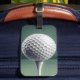 Etiqueta de bagagens com uma imagem de alta qualidade de uma bola de golfe branca sobre uma teia branca em frente a um fundo verde.