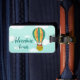 Uma mala adorável com o ditado inspirador "Adventure espera" e uma ilustração engraçada de um pássaro adorável tirando uma soneca em um balão colorido de ar quente. Personalize as costas com detalhes. Isso seria um presente bonito para o aniversário da criança ou um presente de boa viagem.