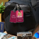 Etiqueta de bagagem personalizada com um design gráfico de Natal brilhante e festivo. O texto diz Feliz Natal e Feliz ano novo. Projetado com um monte em forma de árvore de presentes com flocos de neve festivos, estrelas, bausolas de natal e faíscas brilhantes. Agulhas de pinheiros e ilustração em forma de árvore também estão incluídos nesta imagem de feriado. O fundo é uma cor rosa avermelhada vibrante.