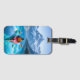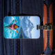 Luggage tag with an illustration of a man kayaking in the ocean by the snow topped mountains. Pretty serene blue tranquil water and pine trees surround him on a peaceful journey.