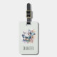 Uma etiqueta de bagagem com um trio de borboletas fluindo entre algumas flores bonito. Esquema de cor rosa azul e verde.