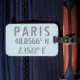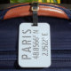 Etiqueta de bagagem de na moda com coordenadas de Paris, França, latitude e longitude, em caracteres urbanos modernos