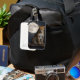 A powerful leopard with piercing yellow eyes and a sleek, spotted coat sits majestically on a stark, solitary branch. One paw dangles artfully across the center of the illustration, hinting at movement. Behind him, a vast, luminous harvest moon hangs in the inky night sky, casting an ethereal glow. Awesome luggage tag for anyone who loves leopards.