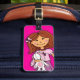 Uma etiqueta de mala, ideal para as crianças, esta etiqueta de identificação irá ajudá-lo a encontrar o seu caso. Personalize com seu nome e endereço no sentido inverso. Uma mala rosa brilhante e útil com uma garota morena de cabelos escuros segurando seu fofinho de coelho recheado. Trabalho de arte e design por Sarah Trett.