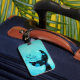 Esta bela etiqueta de bagagem mostra uma fantasia malva cauda num fundo de um barco verde-marinho com uma citação que diz: "O mar está chamando"