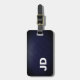 Uma simples etiqueta de mala azul escura com seu monograma.