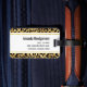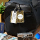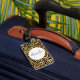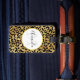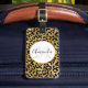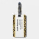 Etiqueta de bagagem com um padrão de na moda. Manchas negras negras exóticas num fundo de ouro. Um estilo selvagem mas elegante. Camadas sobre o topo é uma moldura de círculo branco com uma borda falsa de folha de ouro, com o seu monograma personalizado e dentro de nome.