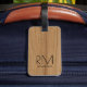 Uma etiqueta de mala elegante com o seu nome e as suas iniciais num fundo imitando madeira... para identificar facilmente os seus pertences quando viaja...