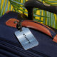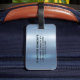 Design uma etiqueta de bagagem monocamil com seu nome e informações de contato contra um fundo azul metálico elegante. Saia da multidão e faça uma declaração com sua etiqueta personalizada.