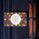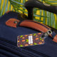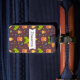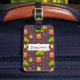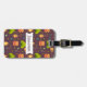 Uma etiqueta de bagagem personalizada projetada com um padrão de acampamento fofo. Ataques temáticos como uma fogueira laranja, uma tenda verde, uma guitarra acústica e outros elementos da natureza como árvores, folhas, e também uma mochila, pá e cantina. Legal padrão externo.