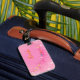 Estrelas cor-de-rosa e coloridas e efeito de brilho em uma etiqueta de bagagem de casamento. Leituras: Noiva