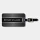 Etiqueta de bagagem de Na moda com o seu nome em branco sobre um fundo preto com bordas de gradiente de cinza escuro de cima e de baixo. Endereço atrás.