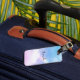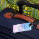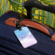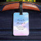 Uma etiqueta de bagagem com uma imagem de fundo suave e adorável. Azul pastel e nuvens cor-de-rosa com um arco-íris mágico.