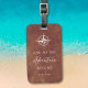 Saia numa multidão com a nossa aventura de na moda, etiquetas de bagagem personalizadas. Design apresenta uma bússola branca com a citação "E assim a aventura começa" sobre um fundo impressão de couro castanho. Personalize com seu nome.