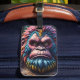Um retrato aproximado de um Pé Grande com um casaco de cor arco-íris. Seu olhar intenso e pele colorida criam um contraste impressionante.