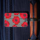 Etiqueta de bagagem monograma com impressão de papoila-chic em vermelho com listras pretas e brancas. Adicione seu nome em uma fonte elegante sobre seu monograma.