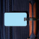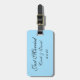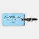A etiqueta de bagagem personalizada é mostrada em uma cor azul clara com texto de Recem casados. Personalize esta etiqueta e altere os nomes e a data para a sua, e coloque também a sua fotografia na parte de trás da etiqueta. Você pode até mudar de cor.