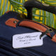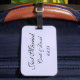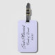 A etiqueta de bagagem personalizada é mostrada na lavanda com o texto do Recem casados na parte frontal e um slot da placa na parte traseira. Personalize esta etiqueta e altere os nomes e a data para a sua.