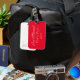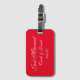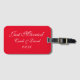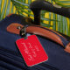 A etiqueta de bagagem personalizada é mostrada em um estilo vermelho e branco com texto de Recem casados na parte frontal e slot de placa na parte traseira. Personalize esta etiqueta e altere os nomes e a data para a sua.