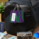 Esta incrível etiqueta de bagagem apresenta uma imagem digitalmente criada que se assemelha a uma série de ondas suaves que ripam contra uma costa calma. As ondas são néon vívidas, de tons verdes, cor-de-rosa e azuis, e têm uma qualidade 3D. Há um texto personalizável na parte traseira da etiqueta de bagagem, permitindo que você o personalize com seu nome e qualquer outro texto de sua escolha.