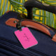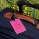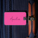 Esta simples etiqueta de bagagem rosa-rosa-quente, resistente e personalizada tem uma fonte de script de na moda e pode ser personalizada com a sua escolha de texto. O verso pode ser totalmente personalizado com seu endereço, garantindo o retorno seguro de sua bagagem, caso seja necessário.