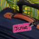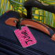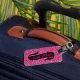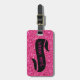 Etiqueta de bagagem com 'look' cintilante cor-de-rosa e faixa preta para nome.