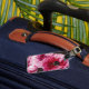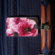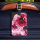 Uma pintura digital de uma flor ranÚnua é impressa na frente da etiqueta de bagagem. Use a ferramenta de edição e altere o texto na parte traseira da etiqueta de bagagem para suas informações de contato.