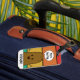 Etiqueta de mala adorável com um bonito e feliz desenho de batata marrom com "This is your bag" escrito dentro uma bolha branca de fala acima da cabeça. O fundo é um padrão retrô fofo de listras vermelhas, laranja, amarelas e azuis. Um modelo na parte inferior para adicionar seu nome.