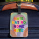 The phrase “HATE HAS NO HOME HERE.” is rendered in cheerful, multi-colored block letters that pop against a dreamy backdrop of painted rainbow curves. Each letter glows with its own hue, creating a sense of harmony and joy — while the sweeping arcs behind them evoke calm, protection, and inclusivity.