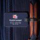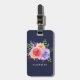 Uma etiqueta de bagagem personalizada com um bom buquê de rosas de aquarelas com galhos, folhas e galhos, todos juntos num arranjo floral colorido. fundo azul marinho.