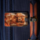 Um retrato detalhado de um Rei Cavaleiro Ruby Charles Spaniel. O cachorro está sentado sobre um tecido laranja e macio com suas patas bem colocadas na frente dele. Seus grandes olhos escuros olham diretamente para o espectador, transmitindo um senso de calor e afeto. O pelo do cachorro é meticulosamente detalhado, mostrando sua textura macia e ondas fluentes. Presente perfeito para amantes Cavalier.