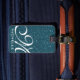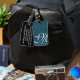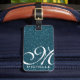 etiqueta azul de bagagem personalizada com tira de couro: monograma e nome de grandes scripts