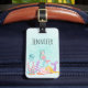 Uma etiqueta de bagagem com uma ilustração de aquarela fofa. 2 sereias nadando sob o mar entre a flora. Uma água-viva feliz também flutua. Querido e ilustração encantadora.