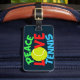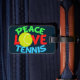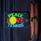 Eu adoro jogar tênis. Um presente de Natal bonito para um jogador de tênis com uma bola amarela de tênis como O in Love. Paz e Tênis escrito em azul e verde.