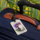 Uma etiqueta de bagagem com um desenho engraçado sobre Trump e sua prisão. Arte original de DBcartoons.