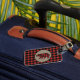 O fundo nesta etiqueta de bagagem é um padrão de xadrez de búfalo vermelho e preto. No centro há uma faixa de círculo bronzeada com um urso de silhueta vermelho e preto correspondente. A parte traseira da etiqueta é preta com dois campos para o seu texto personalizado fácil de ler em branco.