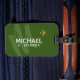 Uma bela etiqueta de bagagem personalizada com o nome do viajante num fundo verde escuro