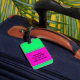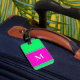 Etiqueta de bagagem com um design verde fluorescente de neon fluorescente impresso e um listrado rosa brilhante com o seu próprio monograma. Uma elegante e atraente bagagem para facilitar a localização da sua mala num aeroporto ocupado.